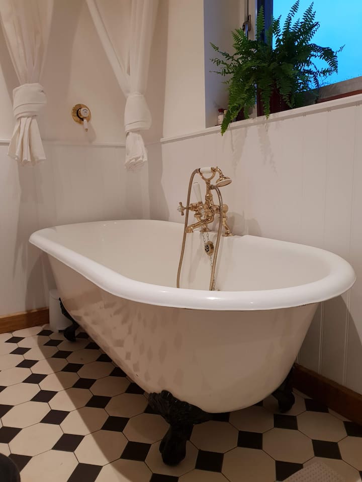 We have an overhead shower and then some old school bath taps with 2-way taps/shower head like you've shown (bath was £90, bargain).