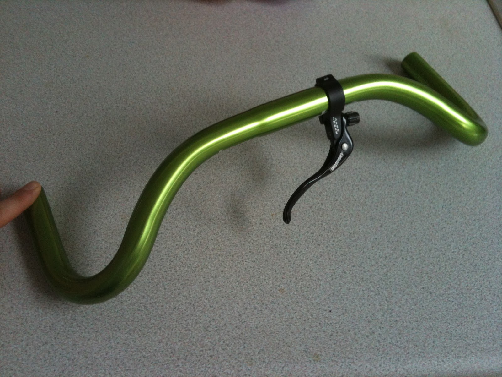 As you can see, an odd but pleasing shape. Now the problems - the top bar area is very narrow and with the brake lever I'm using my non-brake hand will probably be in the way of the exiting brake cable. Due to the odd but pleasing shape to run the brake lever on the correct side of the stem would only allow half the lever travel - making brake setup a pain. But I'll review them once they are all bolted up and can get a good feel of any issues. Also got some Campagnolo brakes - do like Campag ever since my first set of handbuilt MTB wheels were Campag Atek rims on super smooth Mavic hubs.