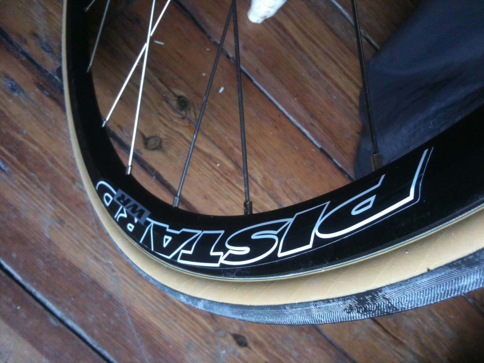 Got all over excited putting air in the tyres, think the gauge read 120psi and something (the tube) went pop - so a bit of a delay before the first ride. Think karma had something to do with it, as I didn't line up the tyre label with the valve hole (did on the back wheel) - lesson learnt, don't f**k with tyre labels and karma.