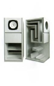 They are Wilmslow Audio Labyrinth Gold speakers http://www.wilmslow-audio.co.uk/labyrinth---gold-1637-p.asp which have a Fostex FE206EN full range driver and then a rear loaded folded horn which takes care of the bass. You buy as a kit and build yourself for £515 (or buy prebuilt for £690), the idea being that you get a speaker as good as something twice the price from an expensively marketed brand. Can be painted purple as on website or any colour you like.