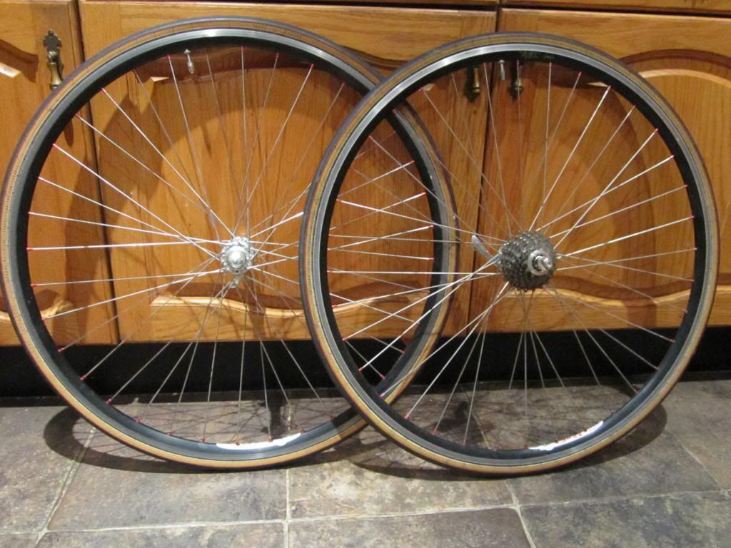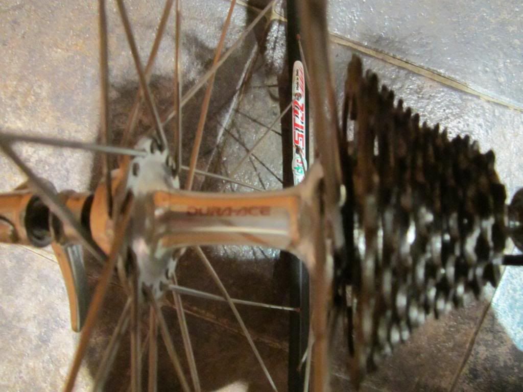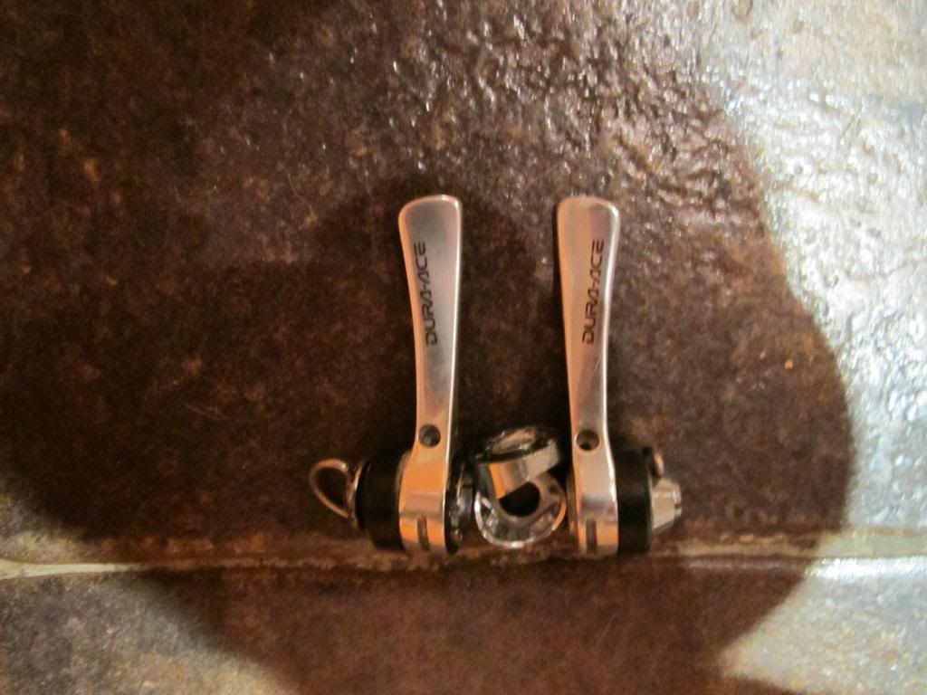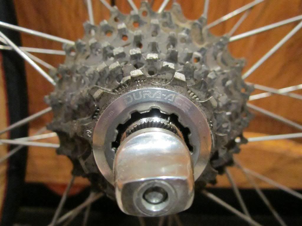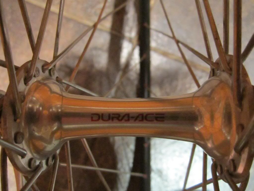 Wheels - Dura Ace 7700 hubs on italian rims with Dura Ace skewers and Dura Ace titanium cassette