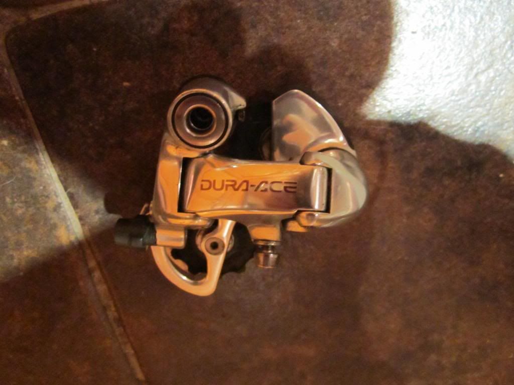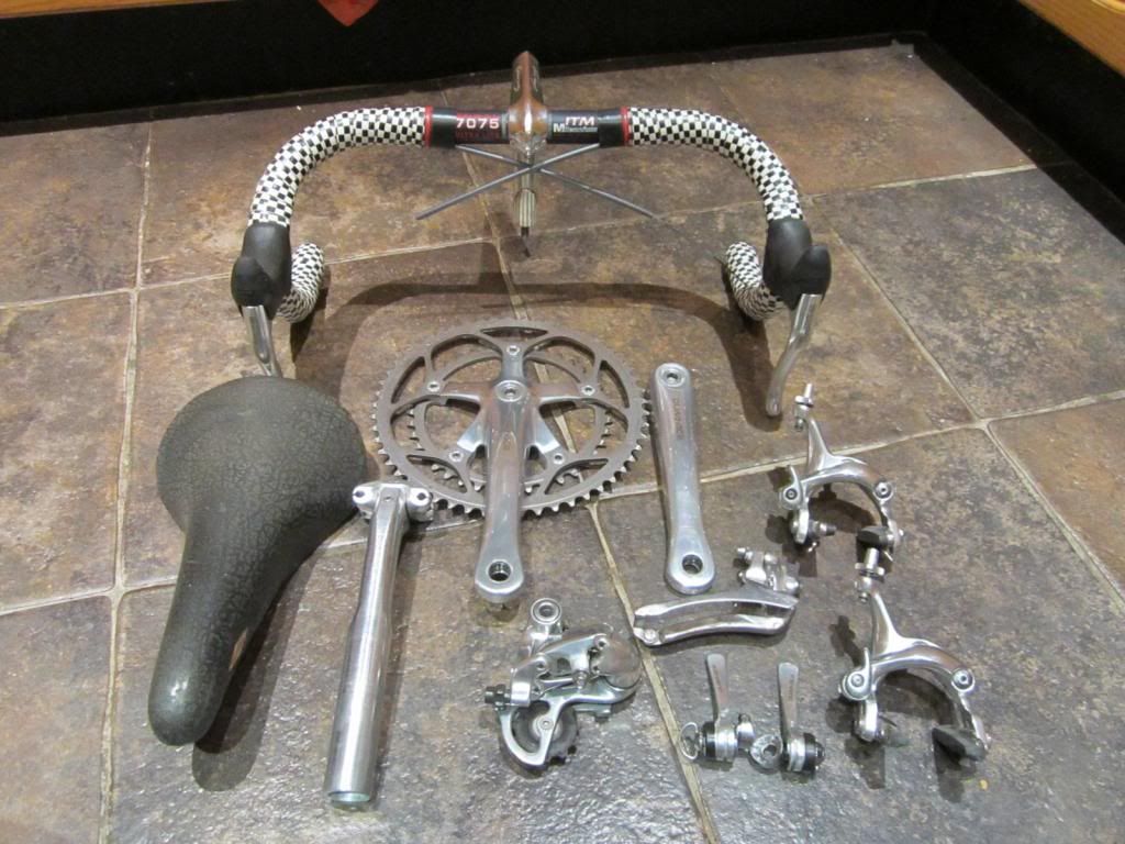 Dura Ace 7700 chainset Dura Ace 7700 bottom bracket - Italian thread Dura Ace 7700 rear derailleur Dura Ace 7700 front derailleur Dura Ace 7700 brake callipers Dura Ace 7700 indexed downtube shifters Dura Ace seatpost 27.2mm Wheels - Dura Ace 7700 hubs on italian rims with Dura Ace skewers and Dura Ace titanium cassette Selle Italia Rolls saddle Bars/stem/brake levers