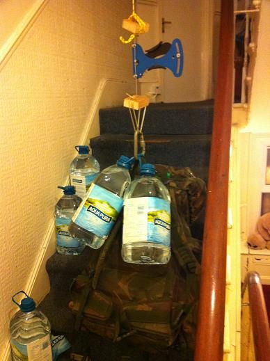 As I said, I have about 40 kg of cast iron weights to start of with, to make up the rest of the necessary weight I decided to use water. I popped down to the shop an bought 60 litres of mineral water. 12 five litre bottles. I carried them home in two trips using my trusty army bergen.