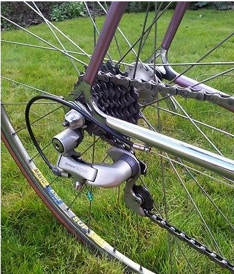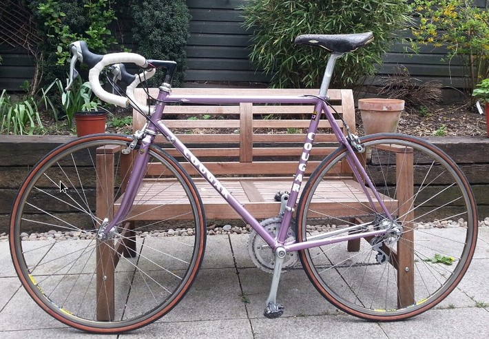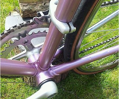 653 reynolds lugged steel Cougar road bike with chrome Gipiemme dropouts and chrome right chainstay. Paint is purple metallic flake.