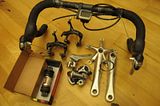 18sp Groupset, Dura Ace rear derailleur, ultegra front, crankset and flightdeck with computer. Techtro brake calipers. Also included is 3t drops (cinelli tape) and raceface bottom bracket, there are a few scratches on the derailleur and the chrome on the hoods but all in perfect working order £75 the lot.