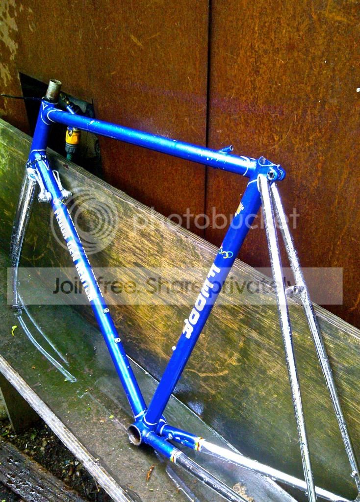56cm frame + chrome forks + pro race number hanger . some paint marks + pitting on the chrome but lovely blue rare frame