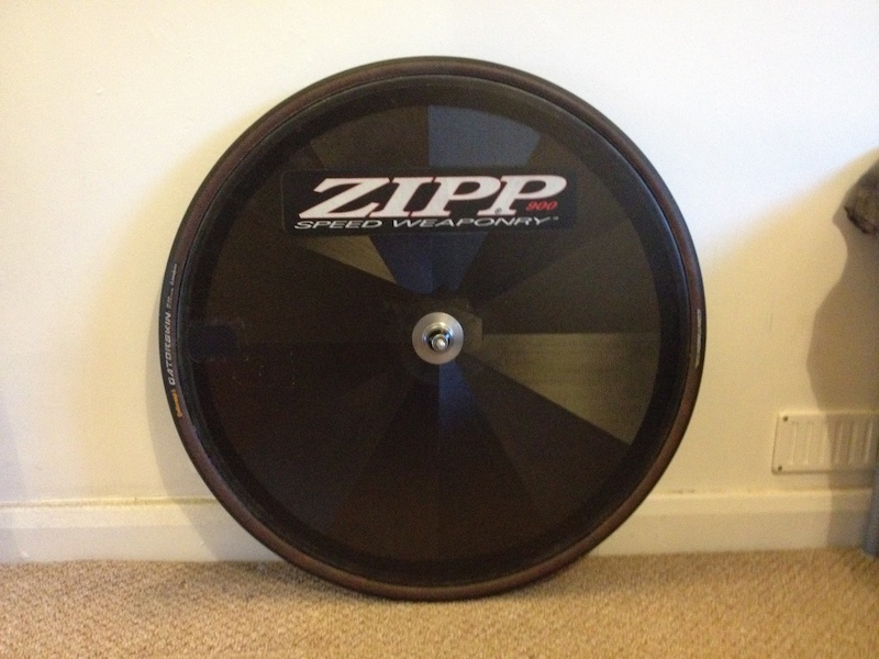 In absolutely great condition, one slight indent. It is tubular and has a virtually new Continental Gatorskin glued on, i'll include a Continental Tempo tubular too. It is designed for fixed gear on one side and freewheel on the other. I have the original road axle, carbon brake pads and cassette it came with. The axle on it now is a home made track conversion, always worked fine for me and it has an EAI 19t sprocket with it.