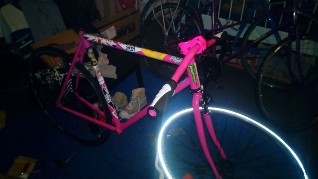 Swapped forks to blue pompino ones to make the rack possible. Double stem+bars till I sort something with spacers+shim for pink bars, likely huge stack to give rack more space meh
