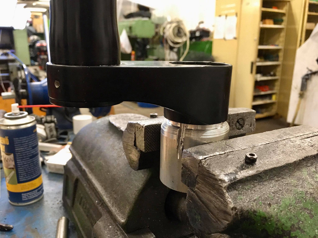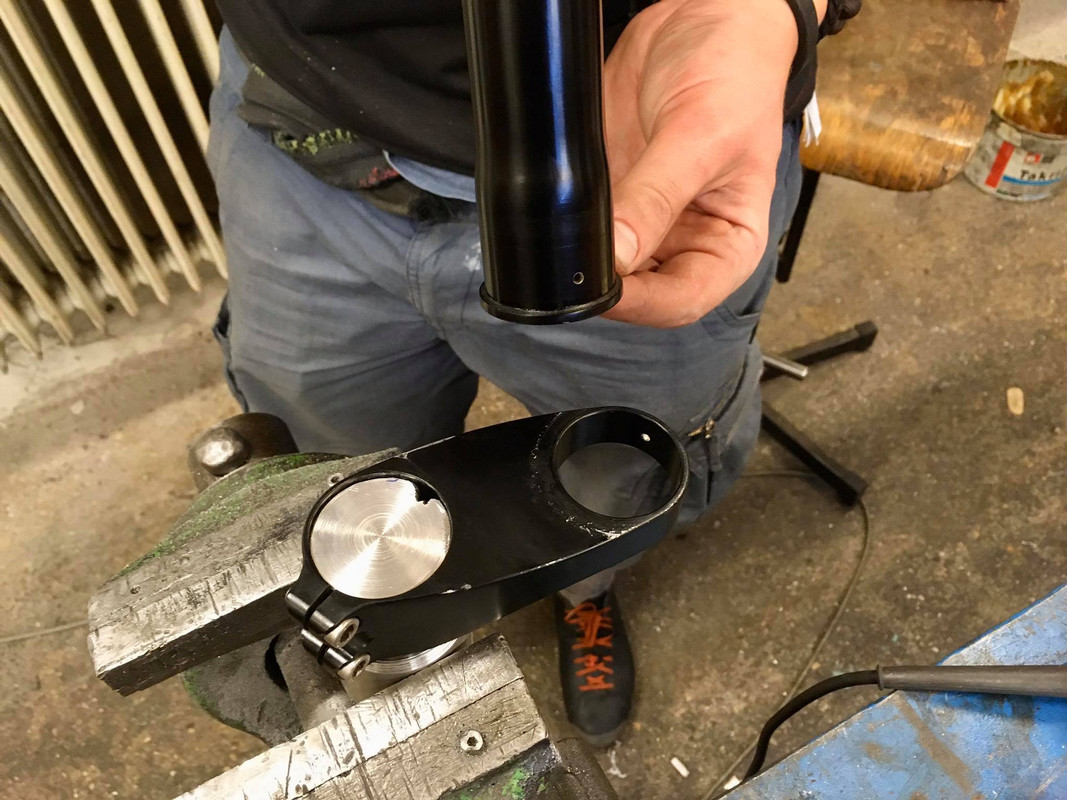 we drilled out the rivet from the lefty's crown and tapped out the steerer - we turned a holder for the clamp and precision-angle-ground a channel so the clamp's notch would fit :)