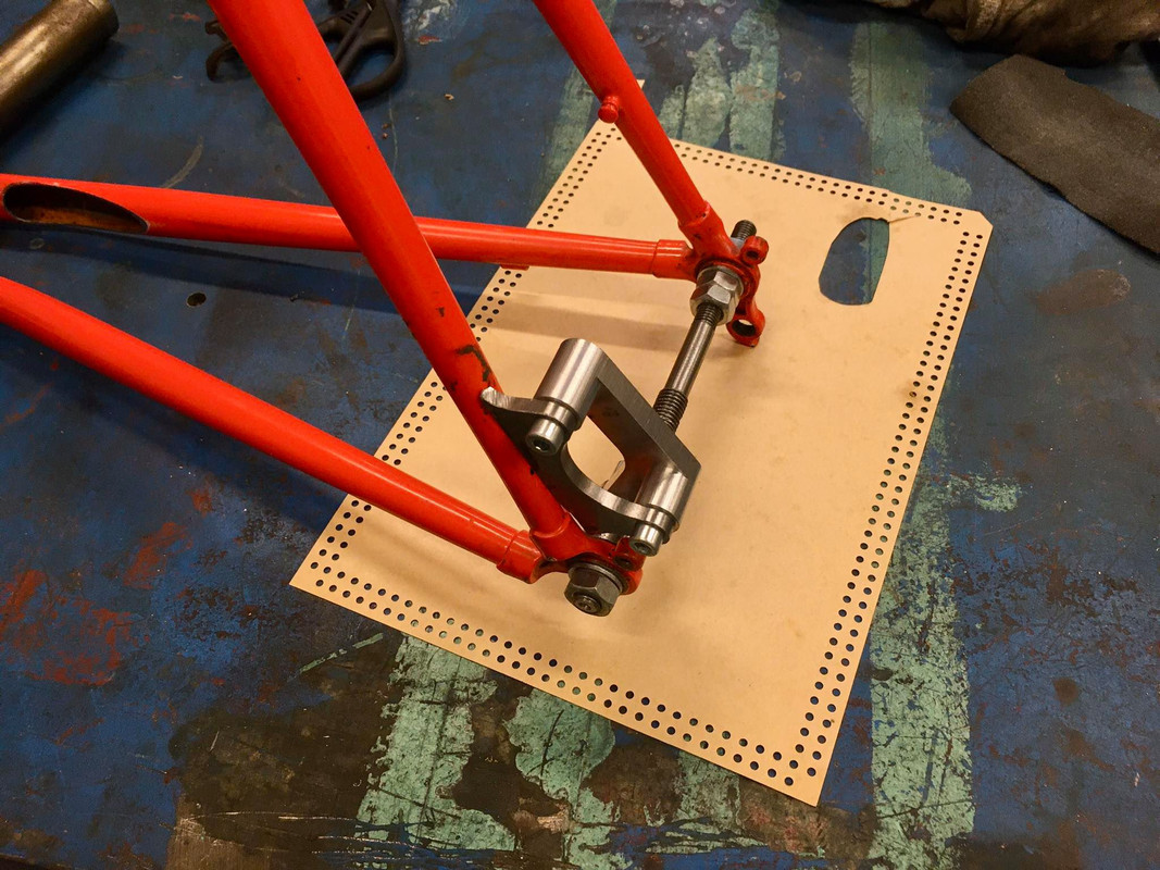 some progress on the honky. i cut out all the stays and made the pieces to cover up the holes. my mate made the disc brake mount jig - some lathe action is still needed, but nearly there (the dummy axle is there to space the frame from 130 to 135, so the brake mount is parallel to the disc and doesn't toe inwards after inserting the wider hub)