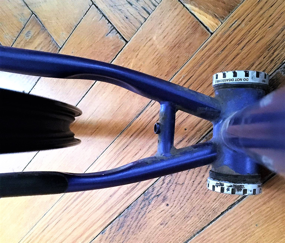 this is the frame/bike i didn't even plan/want.. the £6.50 special :D 2002 true temper ox frame with ritchey dropouts (non-slidey) and disc mount. i have some bits that i'll be using on this, eg. a lefty fork (to be modded with a 28.6 steerer) and some 650b wheels.