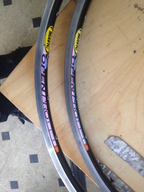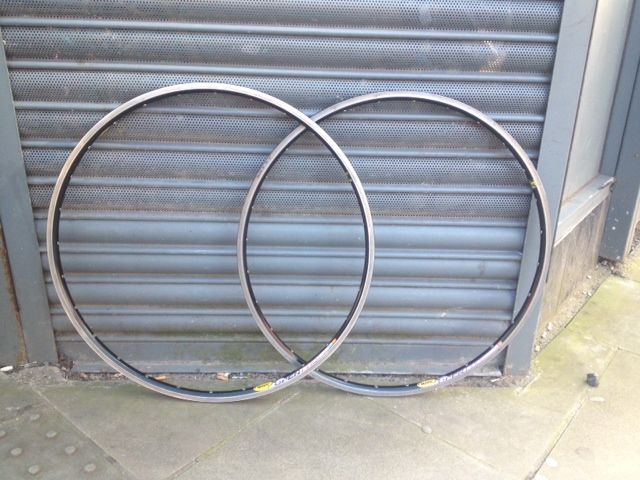 27" aluminium wheel set, bought from ebay a while back, done sub 1000 miles on them and they're all good. come with new tubes and tyres and a 16t single speed sprocket attached.