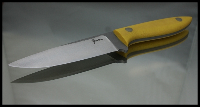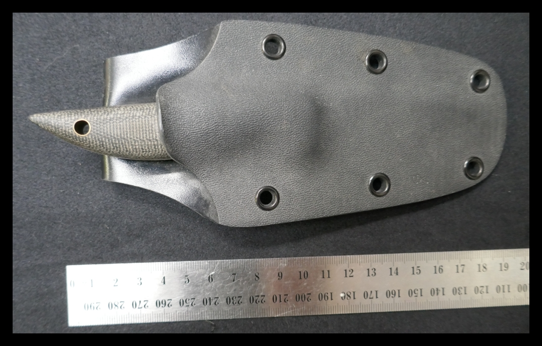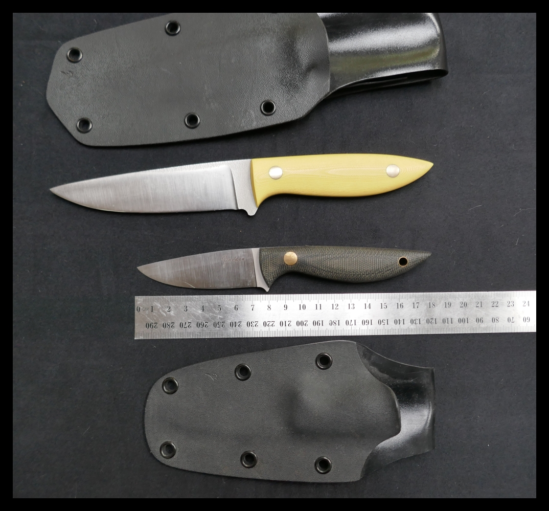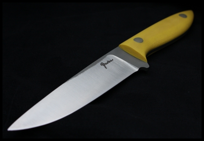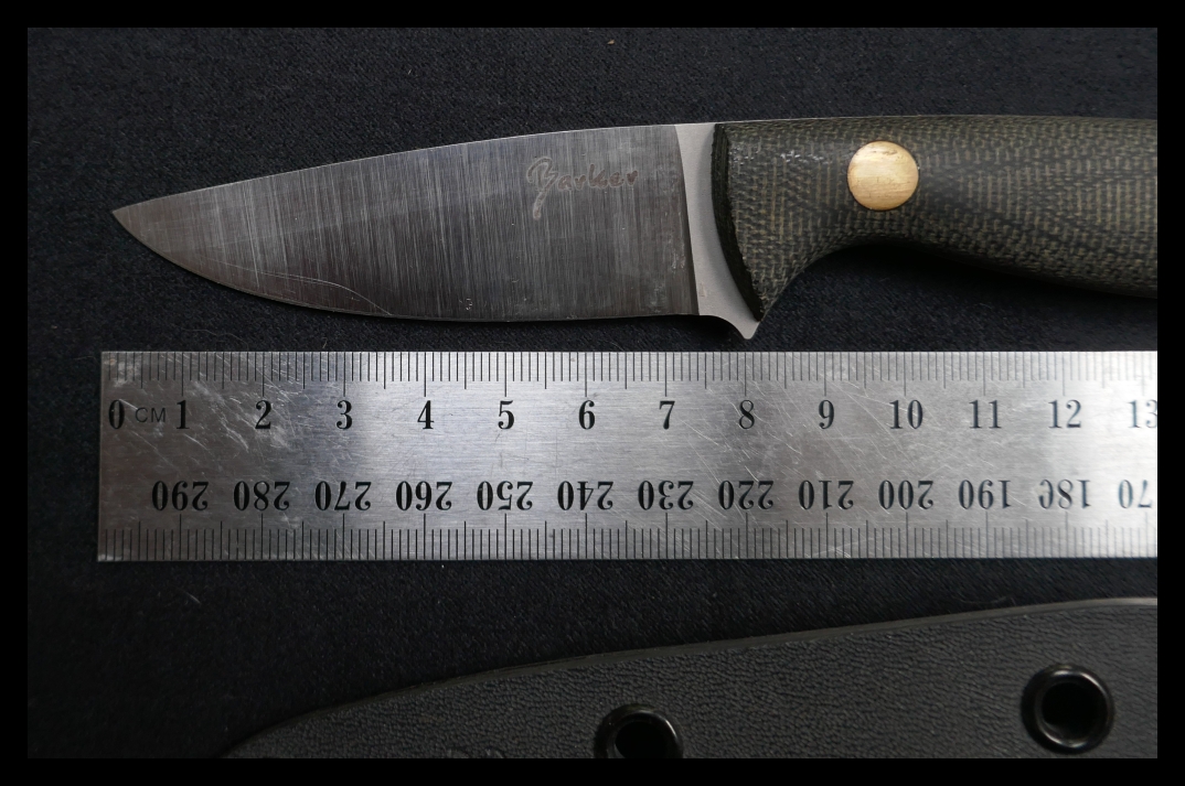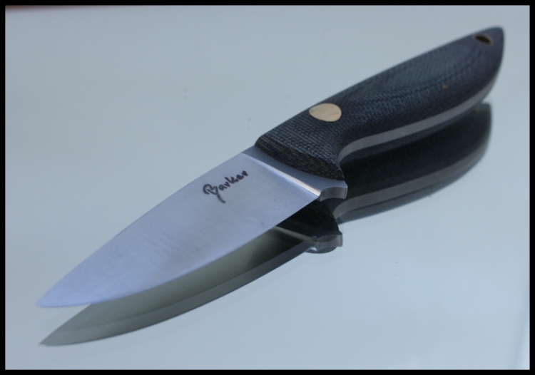 e. Barker Companion, small general purpose camp knife; black micarta (I think) scales and hard sheath: