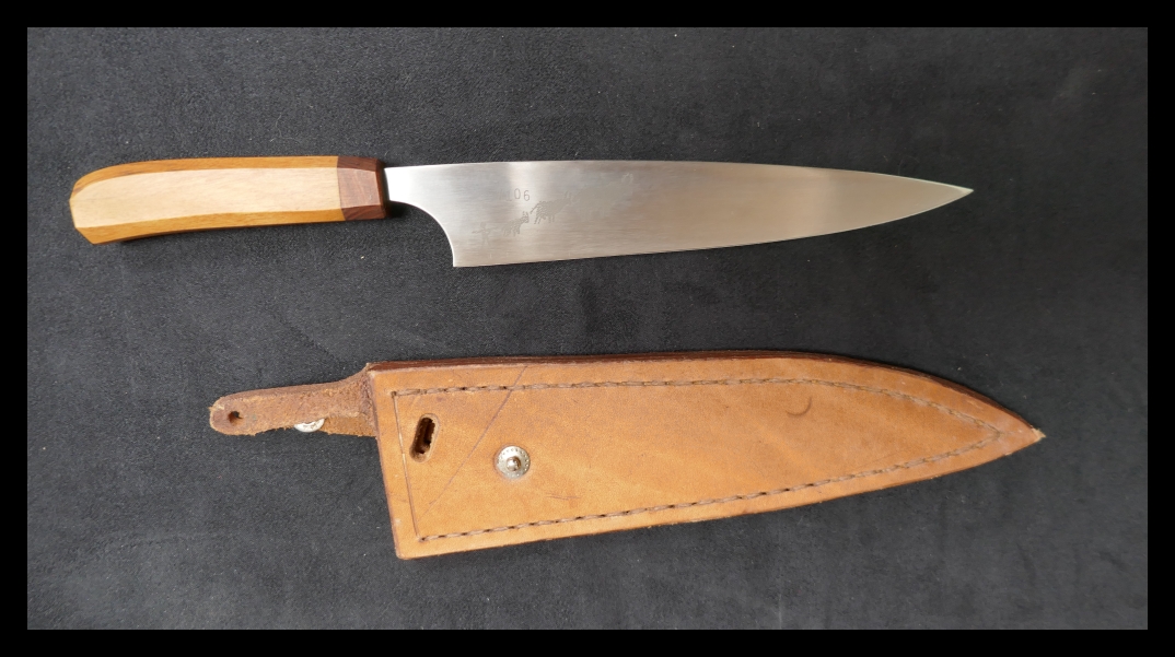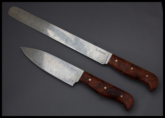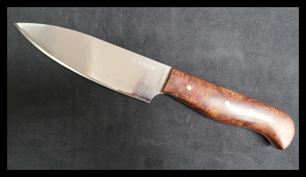 B. D Edwards, chef's knife, damascus steel blade; red liners; can't remember what the scales are. This (and a slicer) were made for me, but a. I had never specified a knife before and b. the maker was young and inexperienced - its an absolutely beautifully made knife, but it is just too thick for its designed purpose. Would make a good camp/general purpose knife.