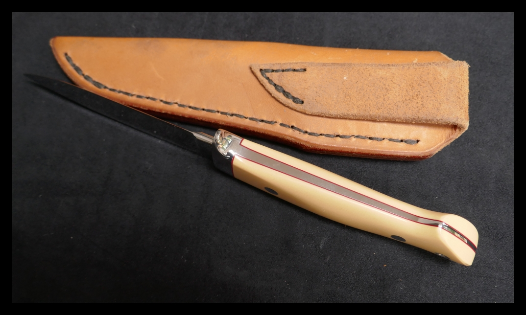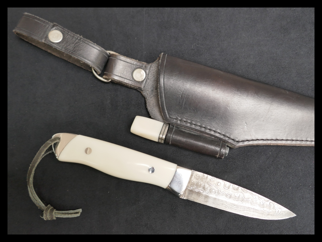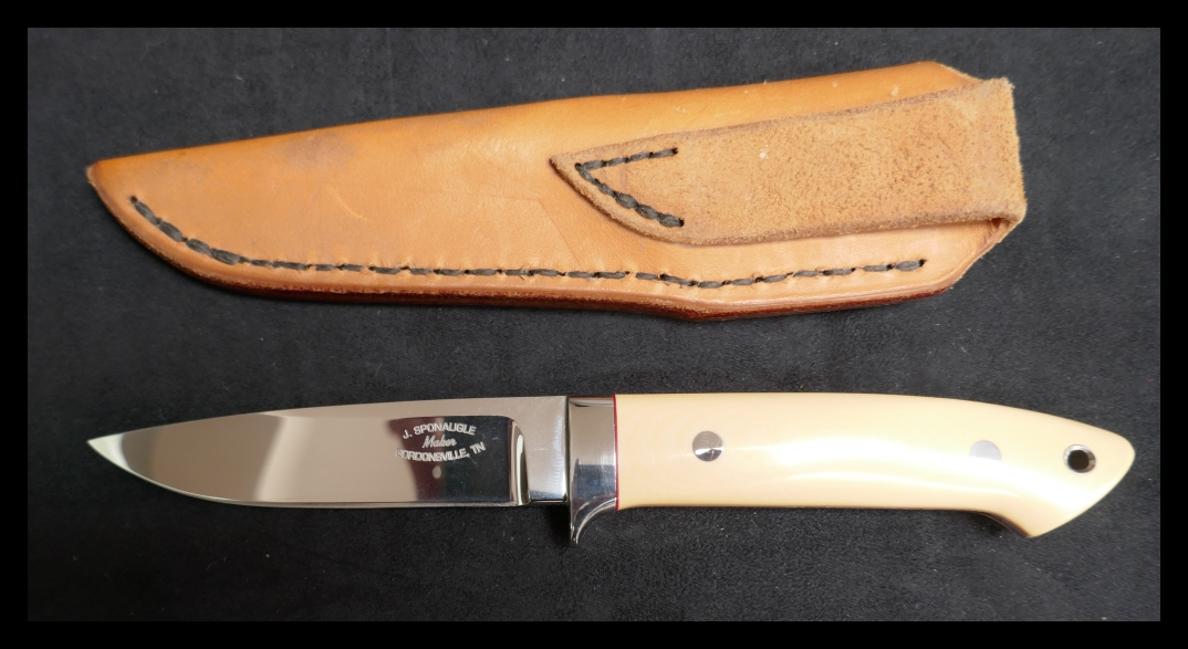 a. James Sponaugle, Loveless drop point style; off-white scales, handmade sheath from a Tennessee maker: