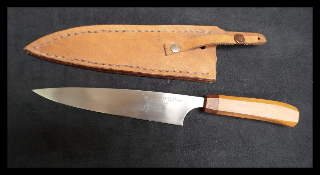 d. Merwe Knives (South Africa); 12C27 Sandvik steel with Rhodesian teak and Matumi handle