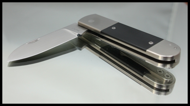 A. Shing Raven, folding knife, S30v blade; stainless bolsters; titanium liners; black G10 scales (almost certainly never been used, just a few minor handling scratches)