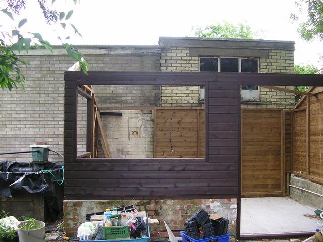 Slight jump of about 2 weeks without photos here. All the walls have now been boarded over with shiplap & painted. Starting to look more like a building at this point.