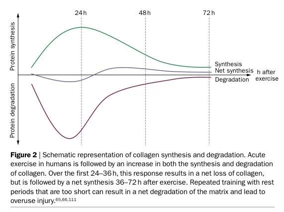 One salient fact, if your injury is less chronic than mine, and something I’ll be adhering to on my return to running: tissue degradation is a normal response to training, and occurs in concert with tissue synthesis immediately afterwards. But the rate of degradation is higher than the rate of synthesis until 30 to 36 hours have elapsed (more time the older you get). Therefore high frequency training runs a real risk of exacerbating injuries.