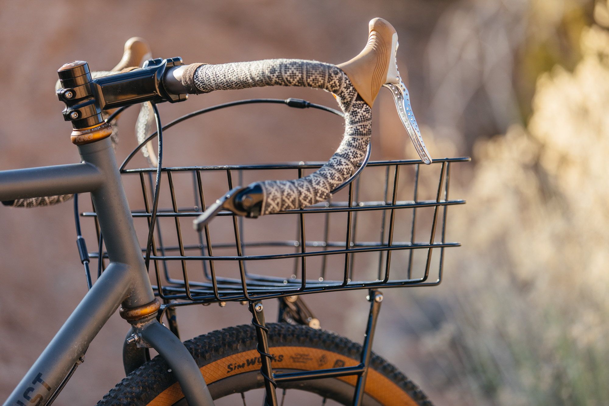 The Spacehorse is my everyday commuter (well, pre-COVID), that I can climb a hill on if I want. Full guards, more road friendly tyres and flat bars. This bike slowly transitioned into something that I can ride for longer distances (the flat bars on my Spacehorse lack hand positions after a while), and on more rough(er) roads and trails. I kept the basket on there because I also plan to do some overnighters to my parents, etc and just take a change of clothes.
