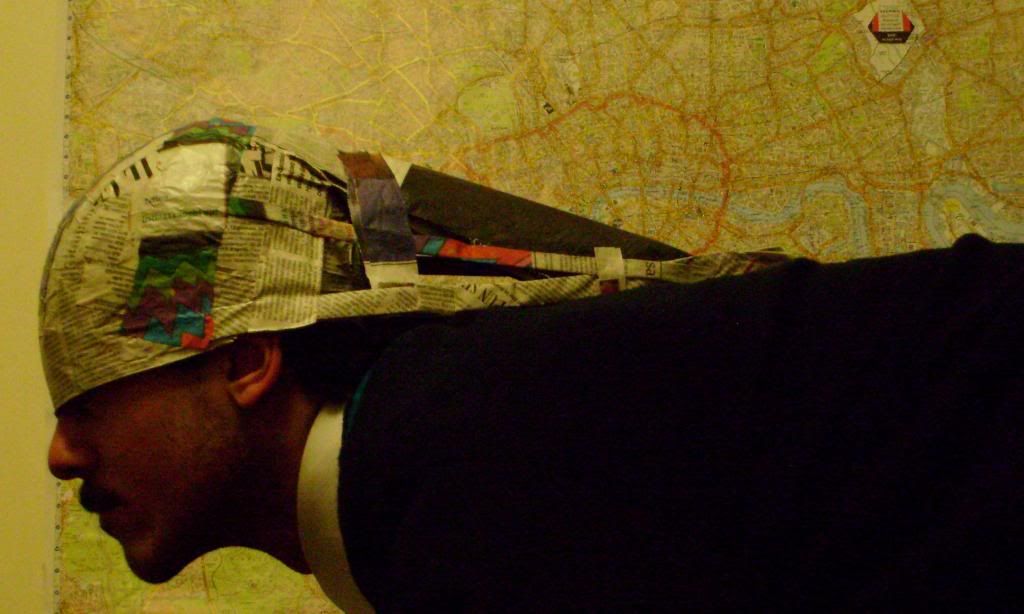 To get to this point I first donned a scruffy old woolly hat and then wrapped it in cling film. I considered using a balloon, but decided to use the actual thing for a better fit. I poured a load of PVA on top, spread it all around and started applying strips of newspaper. Eventually there was enough of a structure and it had started to stiffen up that I could take it off. Hardened, trimmed and edges reinforced I now had a good base to start working on. As I say, that first long wrap-around strip that looks like ear flaps was just a rough guide for angles.I set my camera-phone timer, assumed my high-speed cycling position and from that image I could see that the ‘flaps’ were well off and that actually the tail should extend pretty much straight back from the bottom edge.