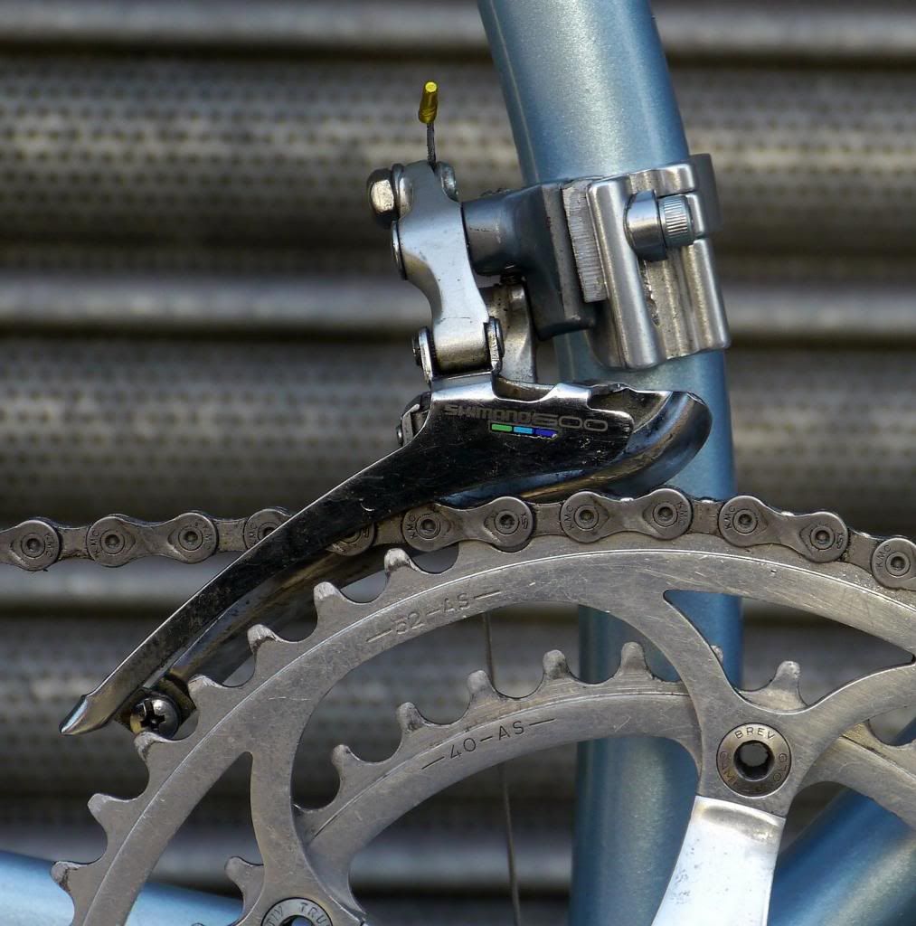Shimano 600 tricolor gears with 8 speed D/T shifters , braze-on front mech with modified adapter bkt.