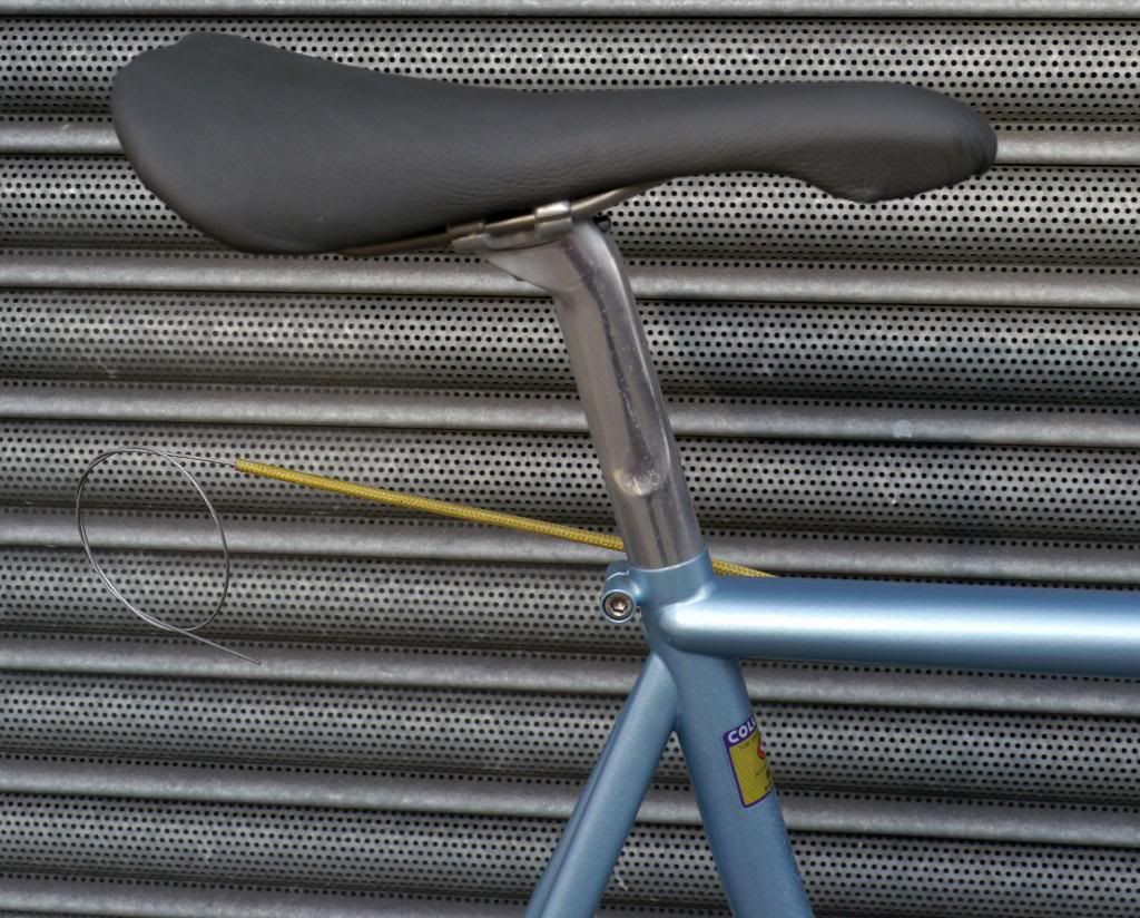 My choice of saddle is of course , a Flite Ti , this one was originally yellow and scuffed up , so I had a go at recovering it in grey leather, now soft furnishings aren't really my bag, but I'm pleased with this as a first effort , leather was obtain off evilbay for £3. Saddle's bolted to a Shimano 600 aero seat post.