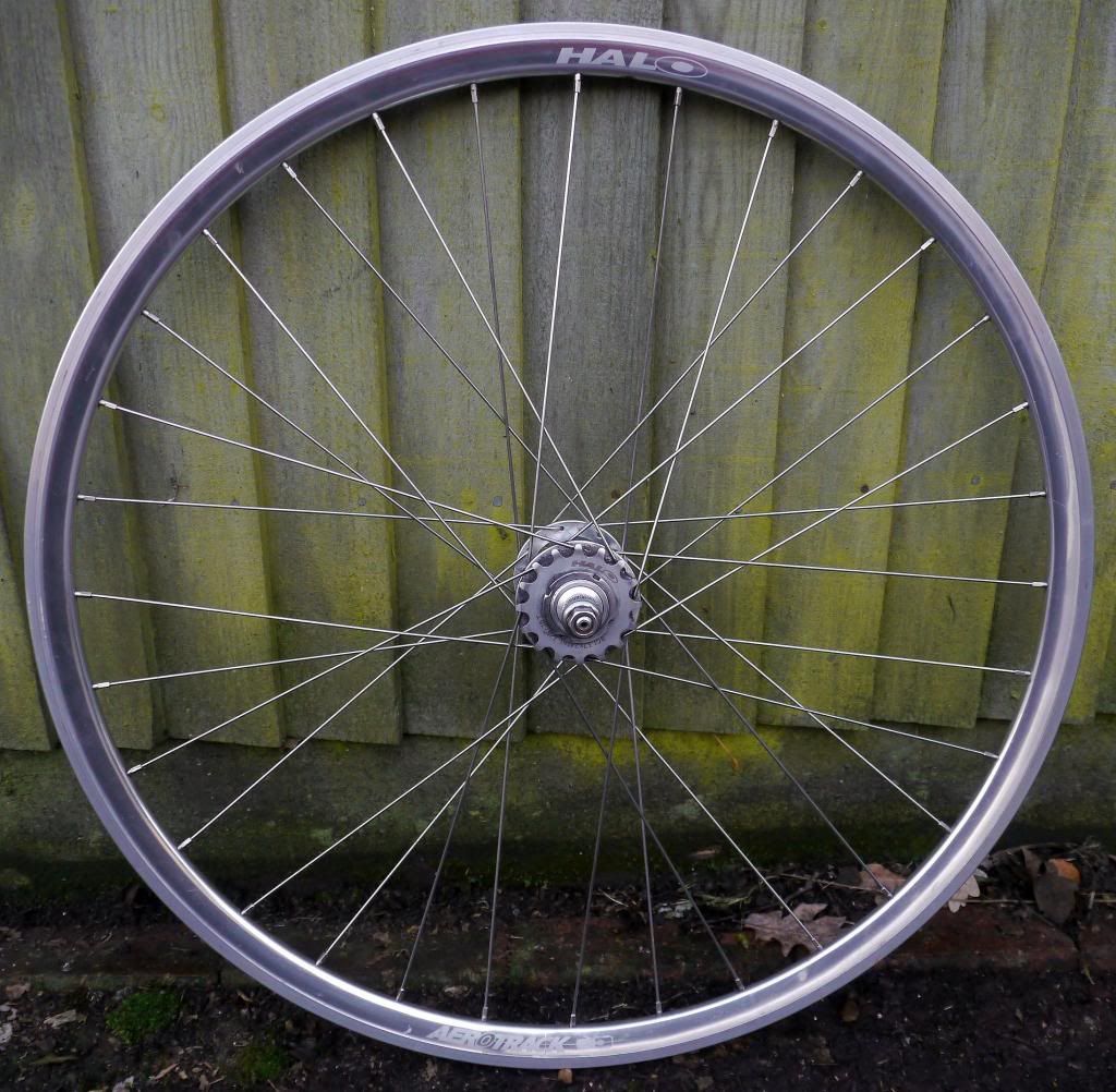 Really good Halo AeroTrack rear wheel in Ano silver.