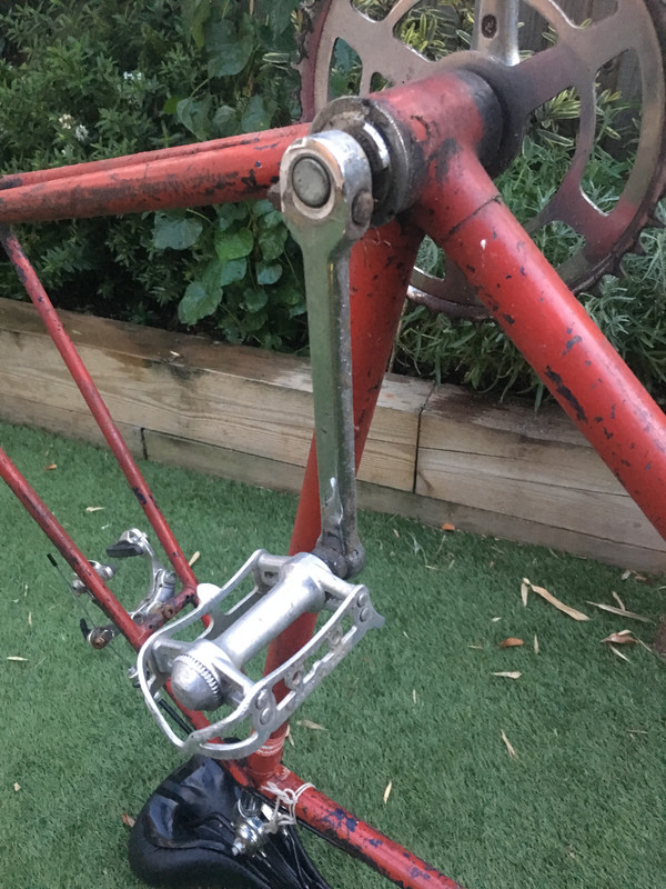 Fixed wheel with front brake. Horizontal dropouts, vintage cotter pin cranks.